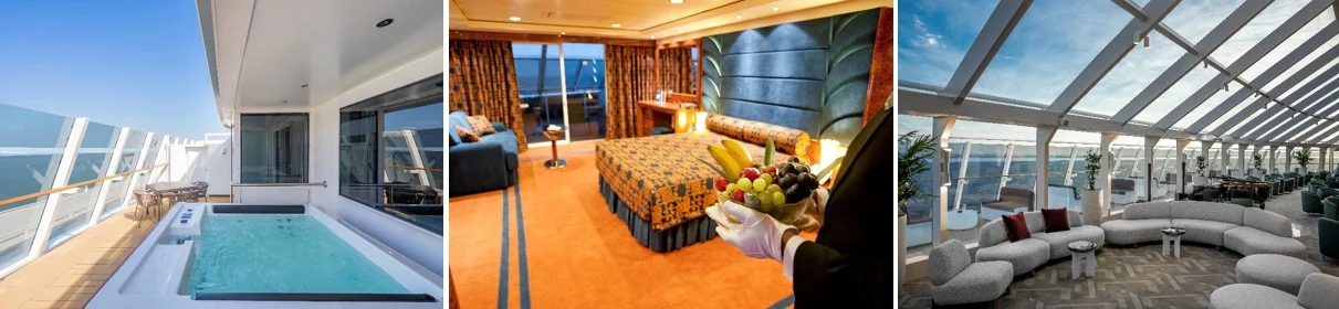 • Prémiové ubytování v apartmá - od Yacht Club Deluxe Suite až po Royal či Owner’s Suite (luxusní matrace, výběr polštářů, vysokokvalitní prádlo, vlastní terasa či balkón)