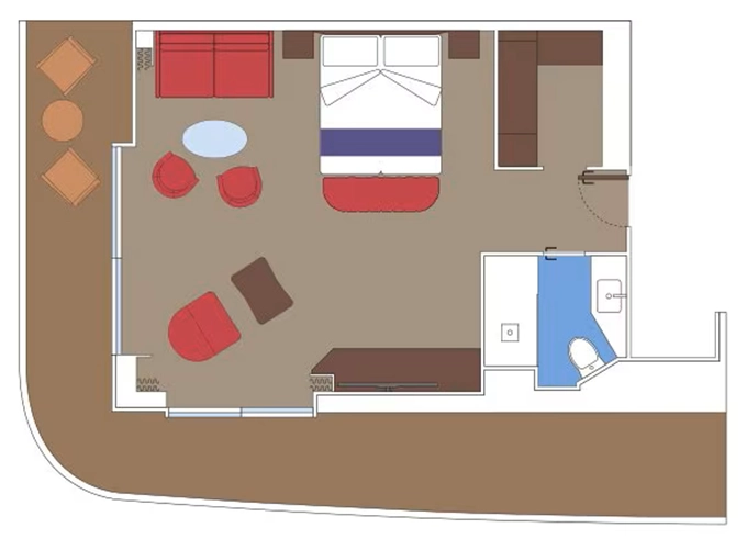 • ubytování v plně vybavené kajutě: vlastní koupelna se sprchou a WC, interaktivní TV, telefon, trezor, vysoušeč vlasů, regulovatelná klimatizace, minibar (za poplatek), Wi-fi (za poplatek)