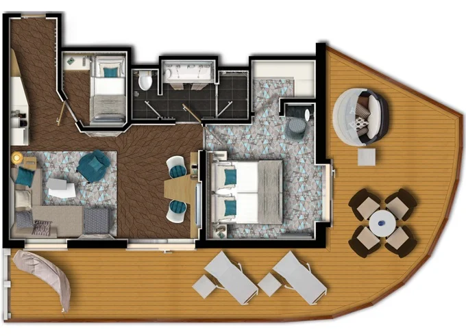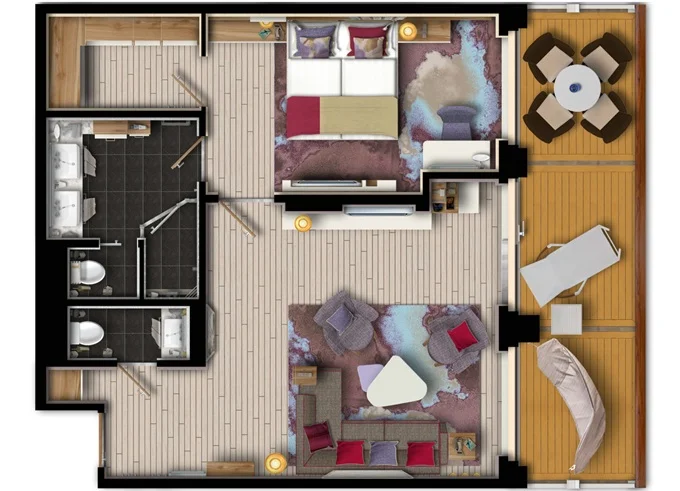 | SUTO - Themen Suite 54 m² + balkon 15 m² se stolem, lehátkom a houpací sítí. Ložnice, Obývací část, šatník. 10. paluba. Max 4 osoby. Výhody Suite. | 227 824 Kč 113 912 Kč za osobu | ||